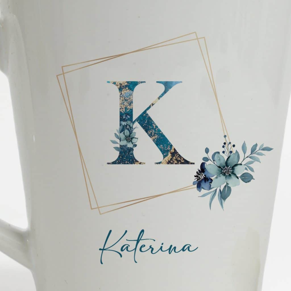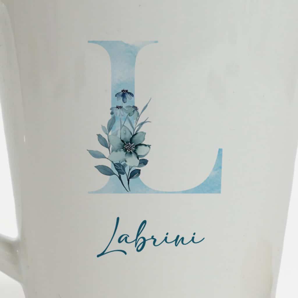 Personalised Latte Mug- Blue Floral Design with Initial