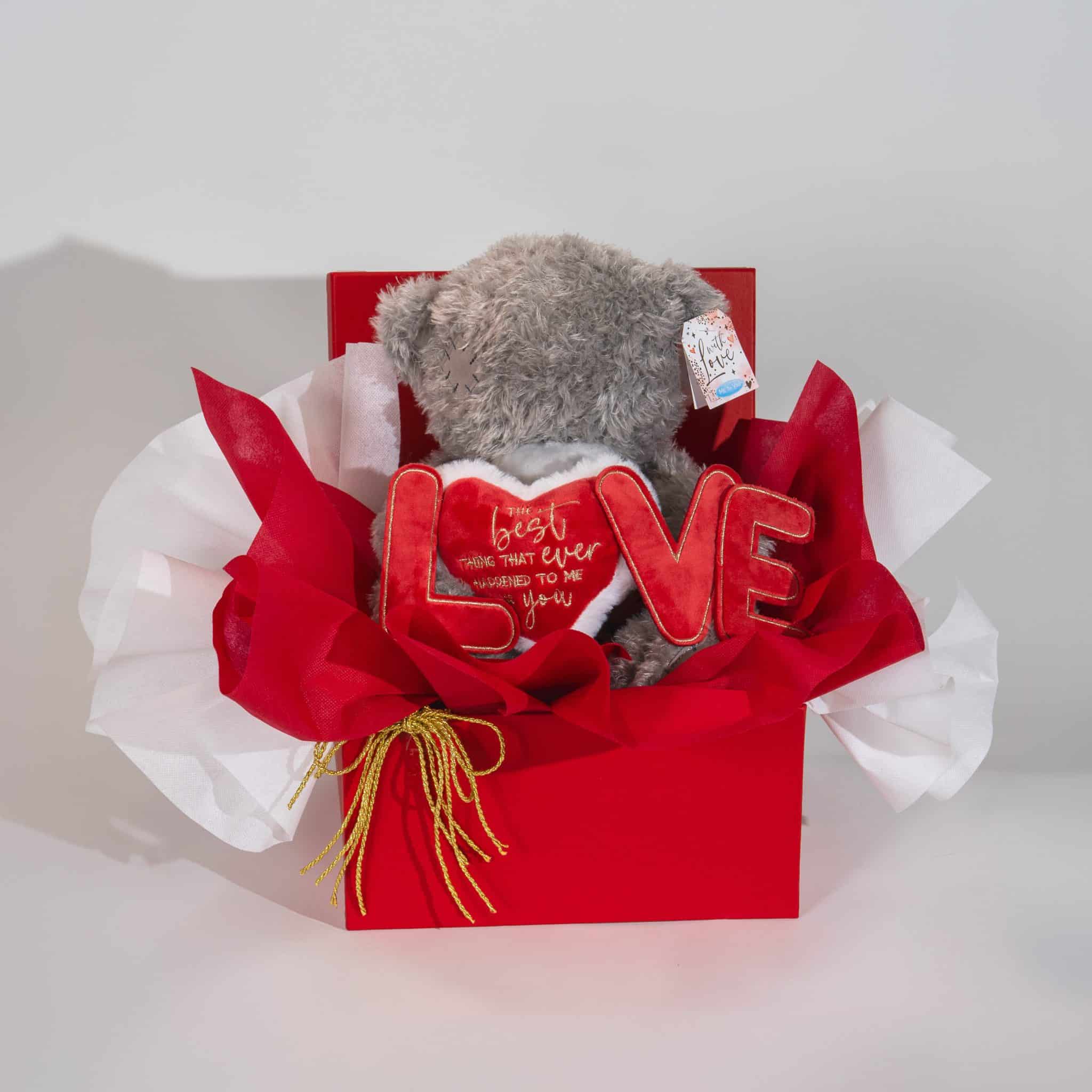 A romantic Valentine surprise filled with warmth and meaning. This elegant gift box features a cuddly teddy and a beautiful love message, perfectly arranged to express your feelings in the sweetest way.