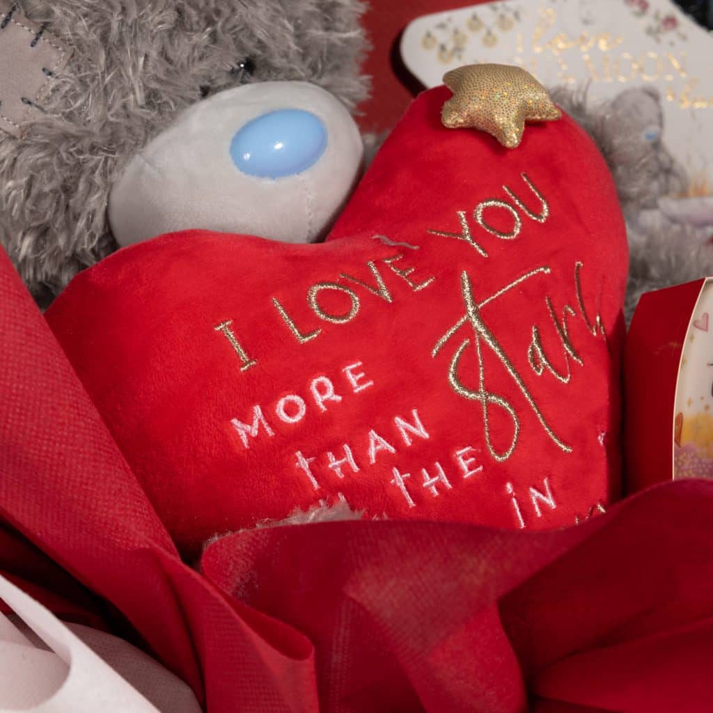 Plush teddy bear with embroidered love message heart