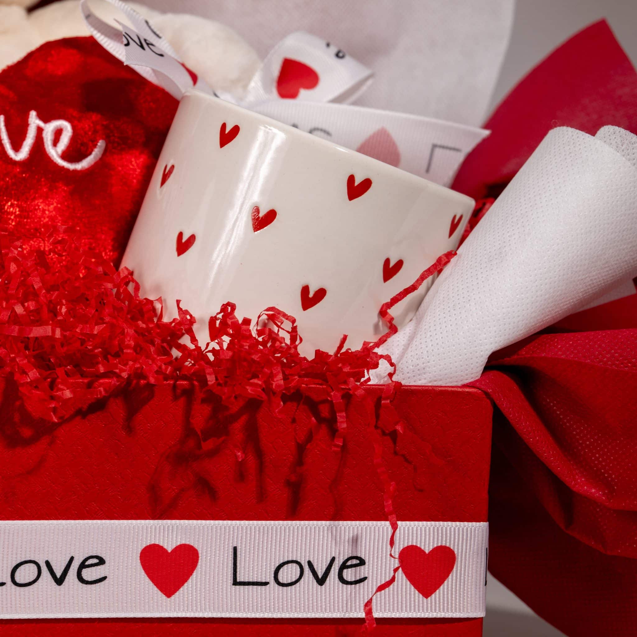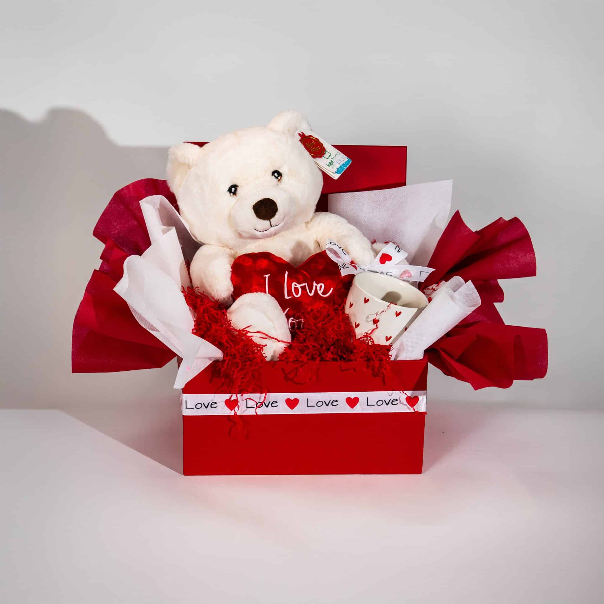 A charming Valentine gift box filled with love and sweet surprises. This romantic arrangement features a soft teddy bear holding an “I Love You” heart, a heart-patterned ceramic mug, and thoughtful details, all beautifully presented in a premium red box with elegant red and white wrapping. A perfect Valentine surprise to share warmth, affection, and cozy moments with someone special.