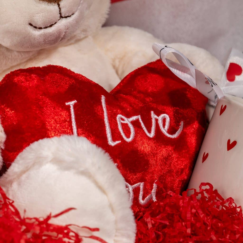 • Plush teddy bear holding an “I Love You” heart