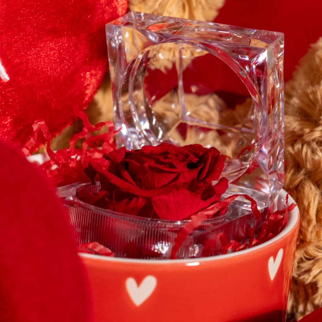 A luxurious Valentine gift box designed to impress and express lasting love. This elegant arrangement features a soft teddy bear holding an “I Love You” heart, a stylish heart-themed mug, and a beautiful small forever rose symbolizing eternal affection. All items are beautifully presented in a premium red box with rich red and gold wrapping, creating a sophisticated and unforgettable Valentine surprise.