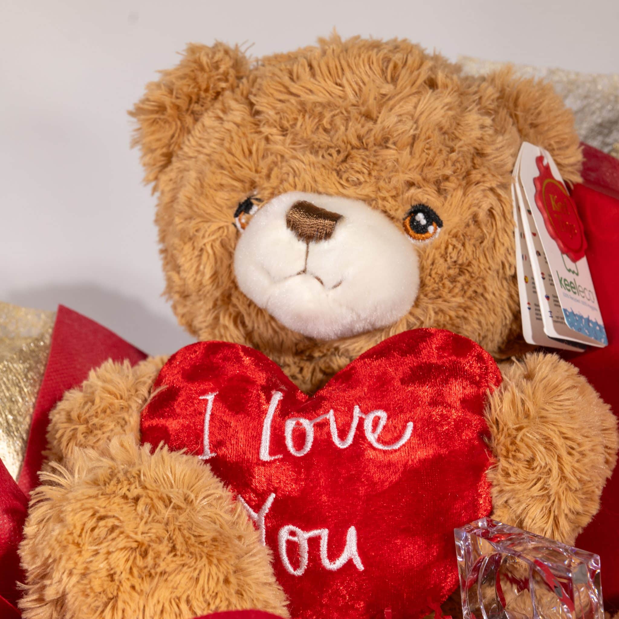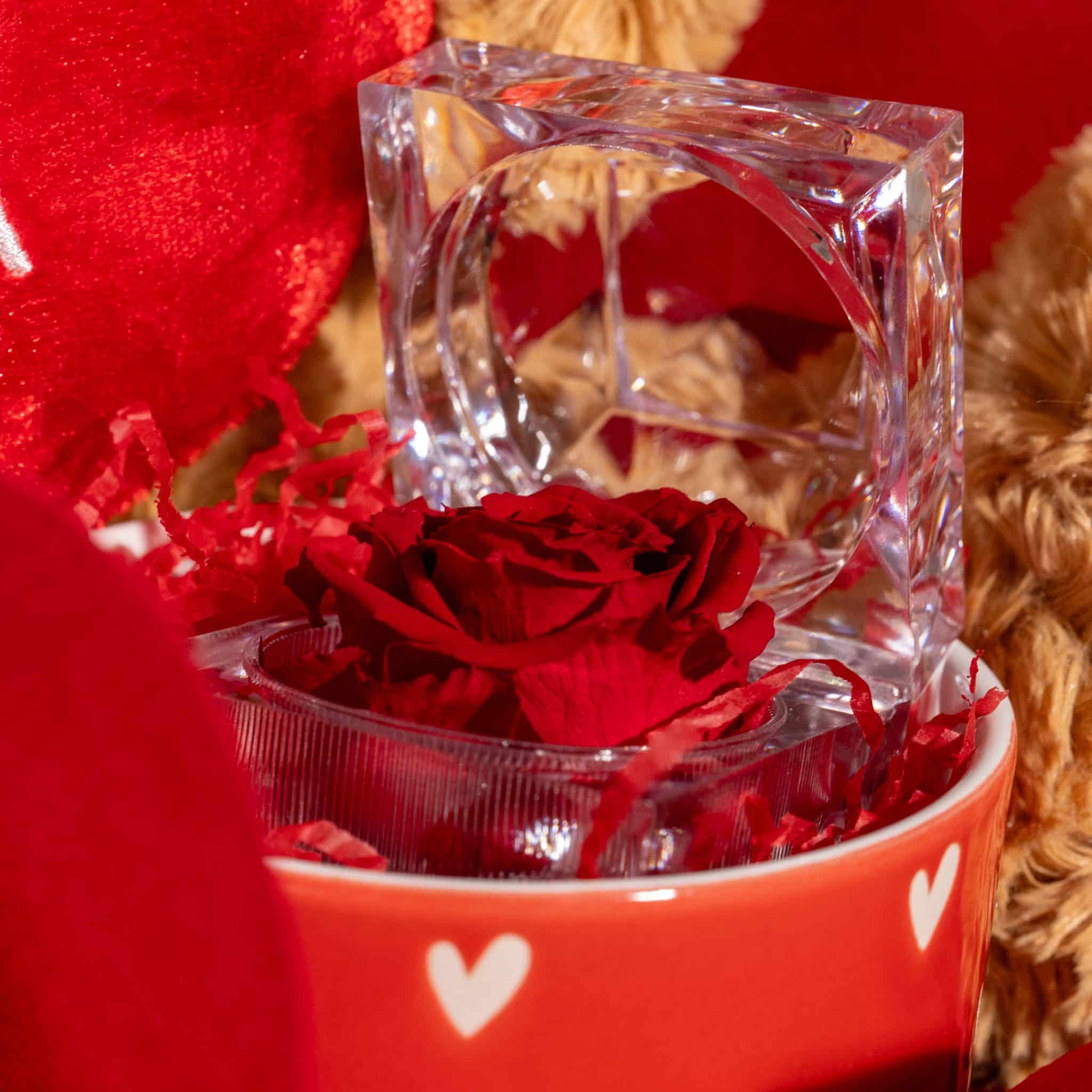 A luxurious Valentine gift box designed to impress and express lasting love. This elegant arrangement features a soft teddy bear holding an “I Love You” heart, a stylish heart-themed mug, and a beautiful small forever rose symbolizing eternal affection. All items are beautifully presented in a premium red box with rich red and gold wrapping, creating a sophisticated and unforgettable Valentine surprise.