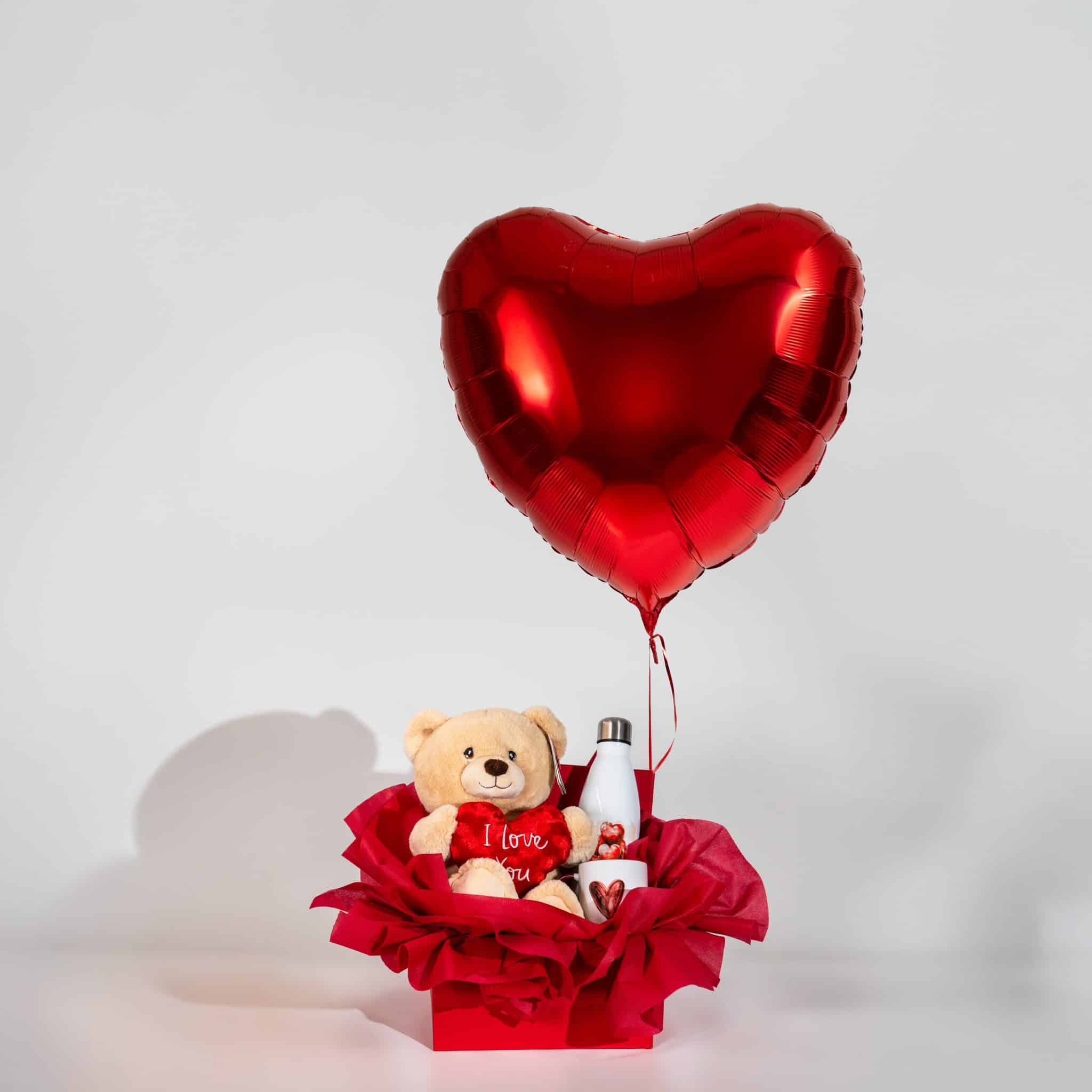 Plush teddy bear holding an “I Love You” heart