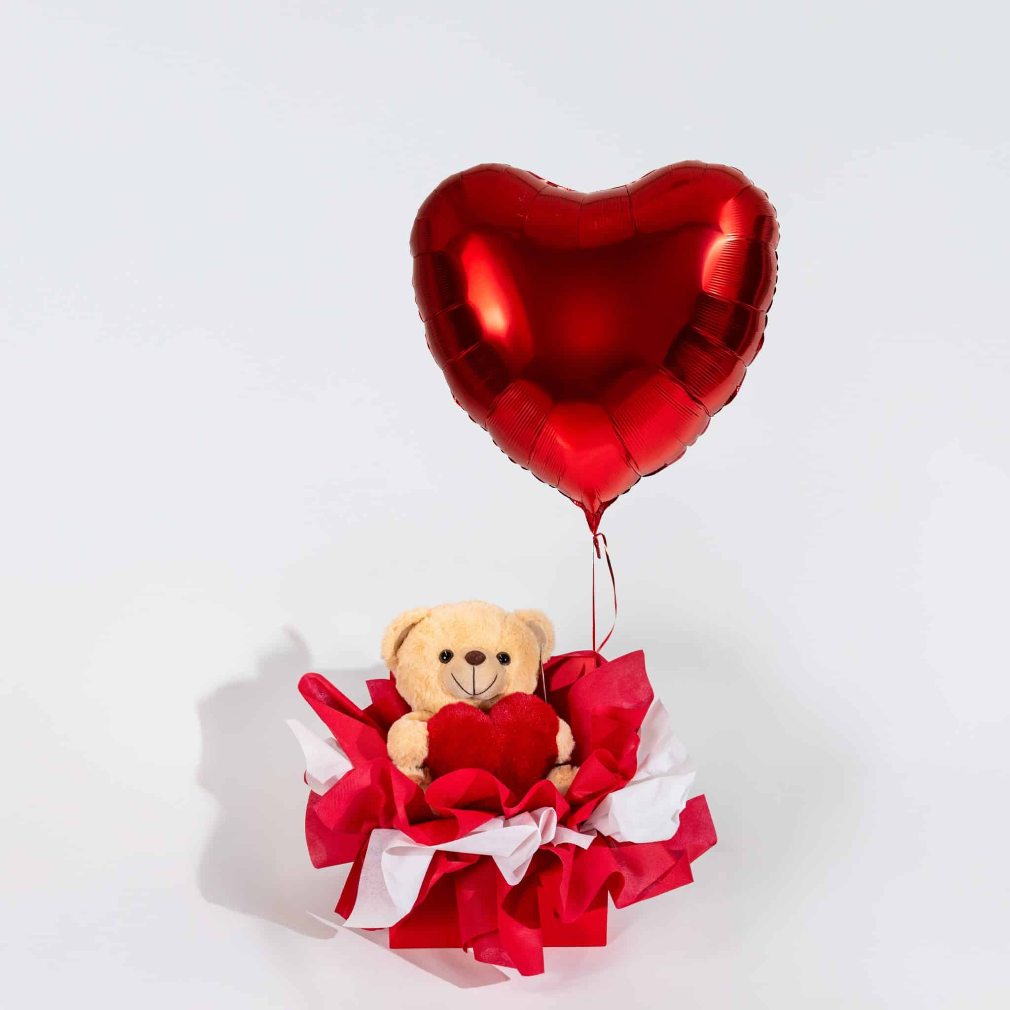 A romantic and eye-catching Valentine gift box designed to make hearts soar. This charming arrangement features a soft teddy bear holding a red heart, beautifully presented in a premium gift box and topped with a stunning red heart-shaped foil balloon. With its elegant red and white styling, this gift creates a joyful and memorable Valentine surprise that expresses love in a sweet and playful way.