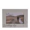 The grey, wooden photo frame showcases a landscape aperture, ‘Wedding Day’ silver title and complementary flower design. It is designed for display using either the attached standing strut or wall hook.