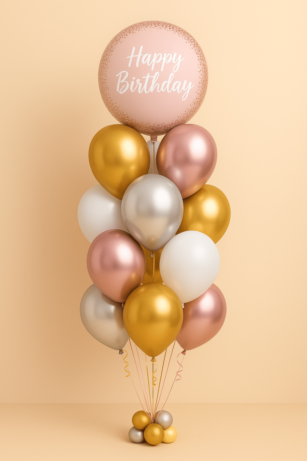 A sophisticated birthday balloon bouquet in rich metallic shades of gold, rose gold, silver, and white, topped with a stylish “Happy Birthday” foil balloon.