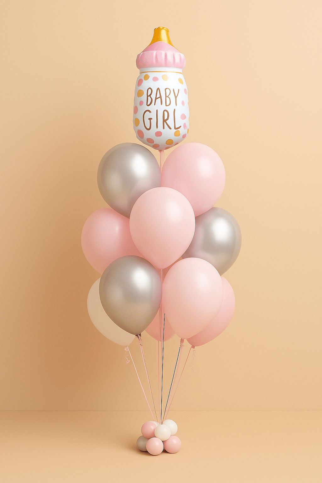 1 large foil balloon shaped like a baby bottle with pink and gold polka dot design and “Baby Girl” text