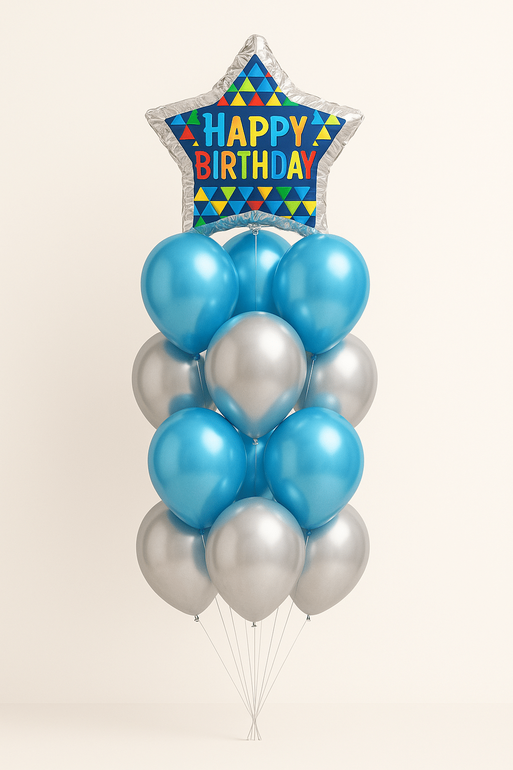 1 large star-shaped foil balloon with a colorful “Happy Birthday” pattern