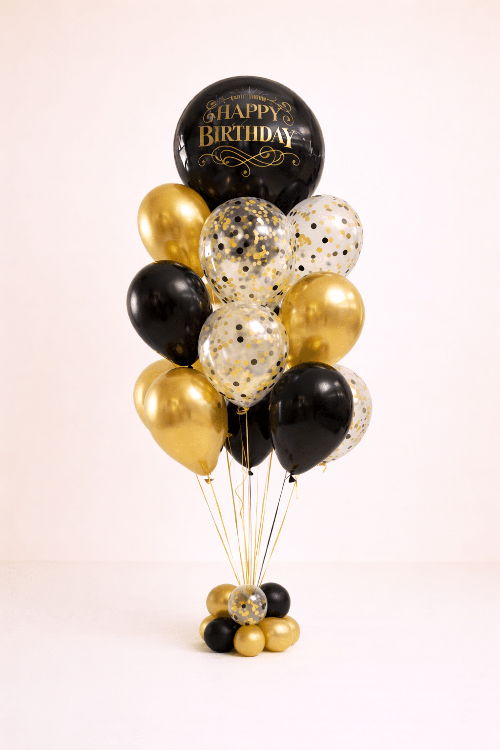 1 Large black round “Happy Birthday” foil balloon with gold lettering
