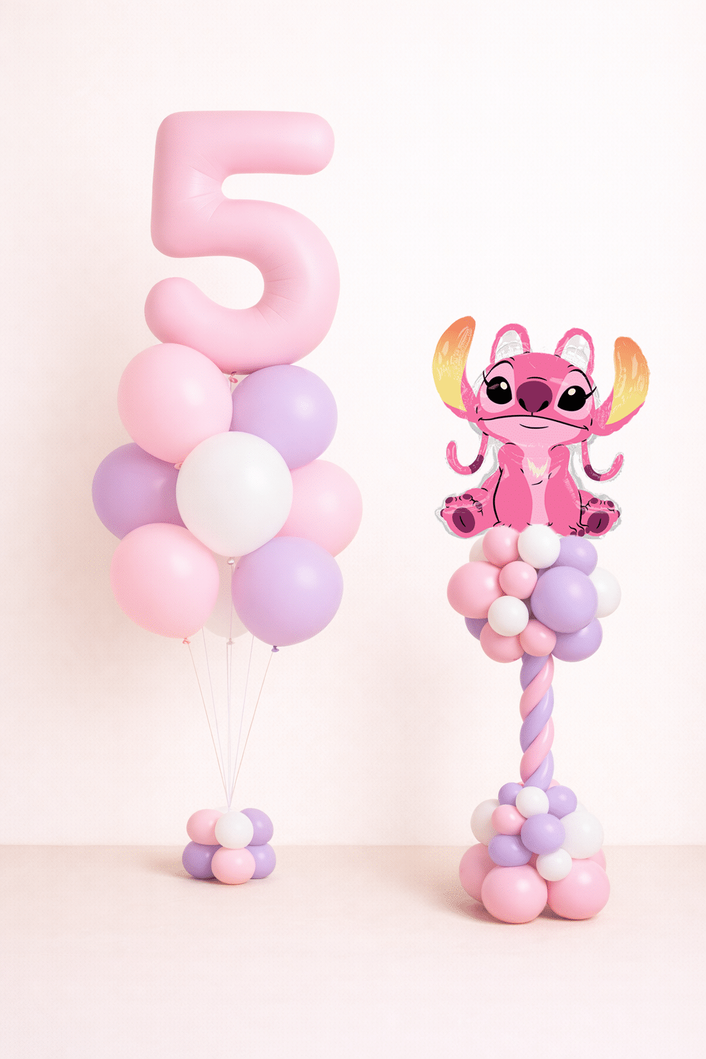 Bring soft pastel charm and playful character to the celebration with this adorable pink Stitch balloon tower — perfect for dreamy birthday moments.