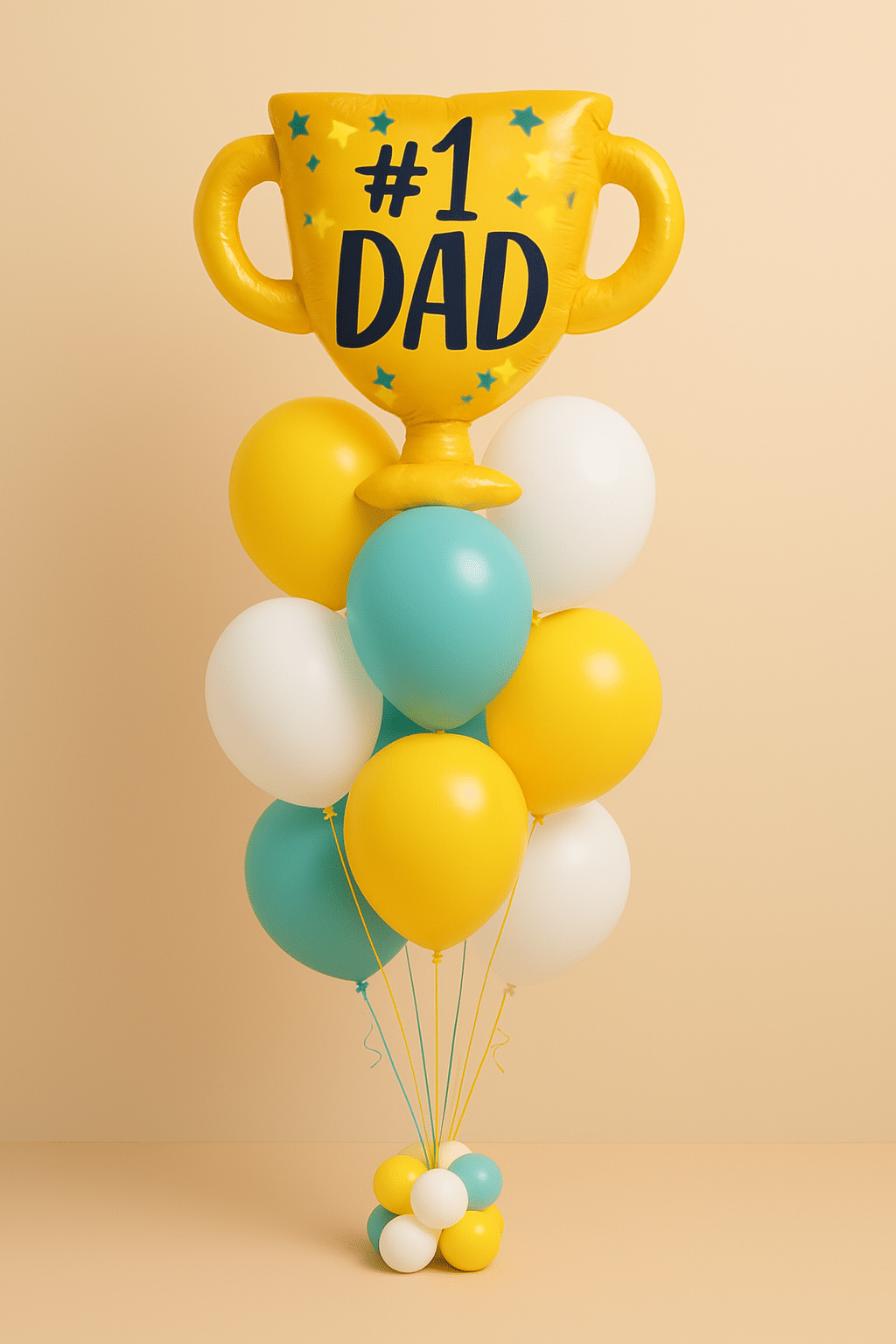 Celebrate the champion in your life with this vibrant trophy balloon bouquet in cheerful yellow, turquoise, and white – the perfect surprise for Father’s Day or dad’s birthday.