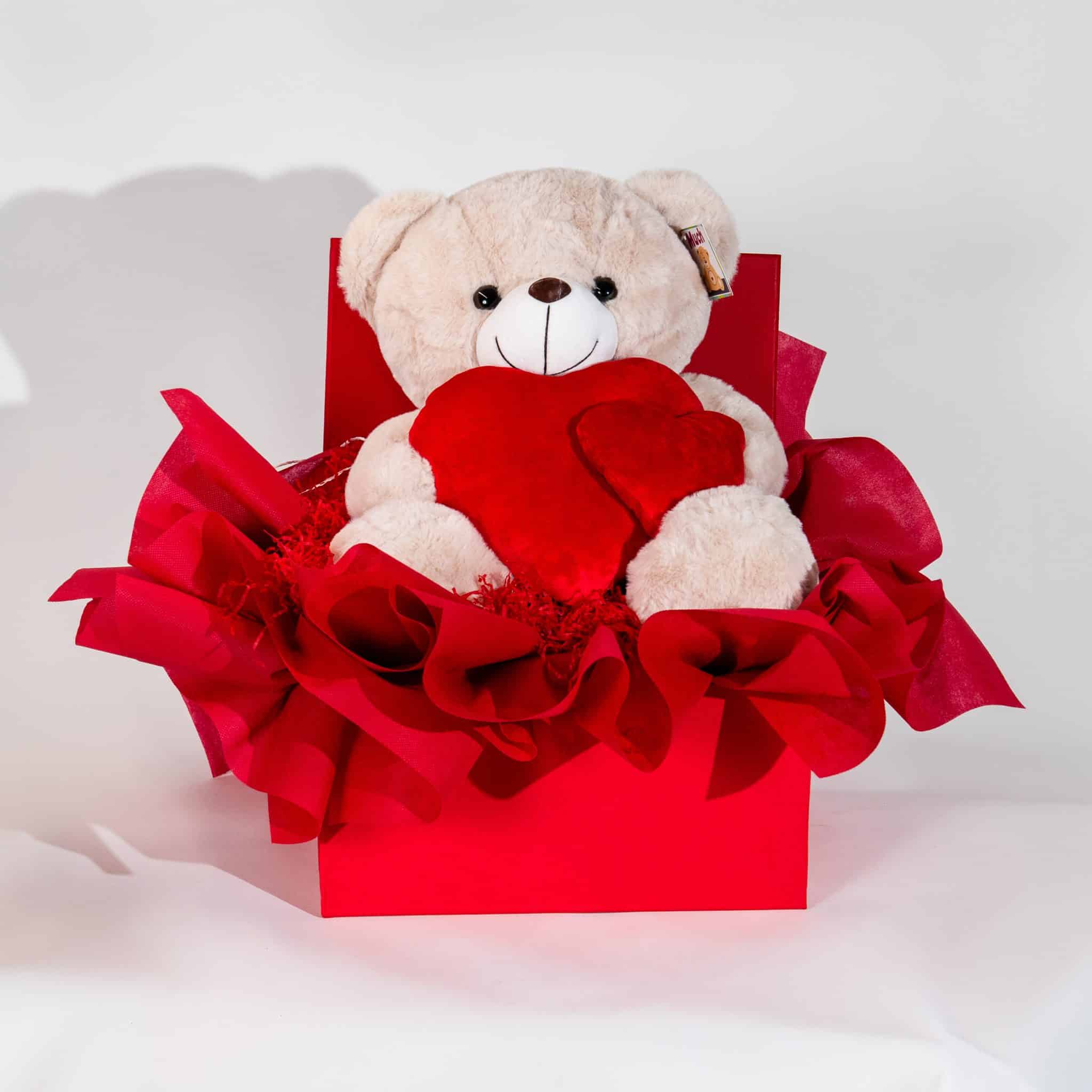 A timeless Valentine gift that expresses love in the most adorable way. This romantic arrangement features a soft, cuddly teddy bear holding a plush red heart, beautifully presented in a premium red gift box with elegant decorative wrapping. A sweet and heartfelt surprise, perfect for showing your love and creating a warm, memorable Valentine’s moment.