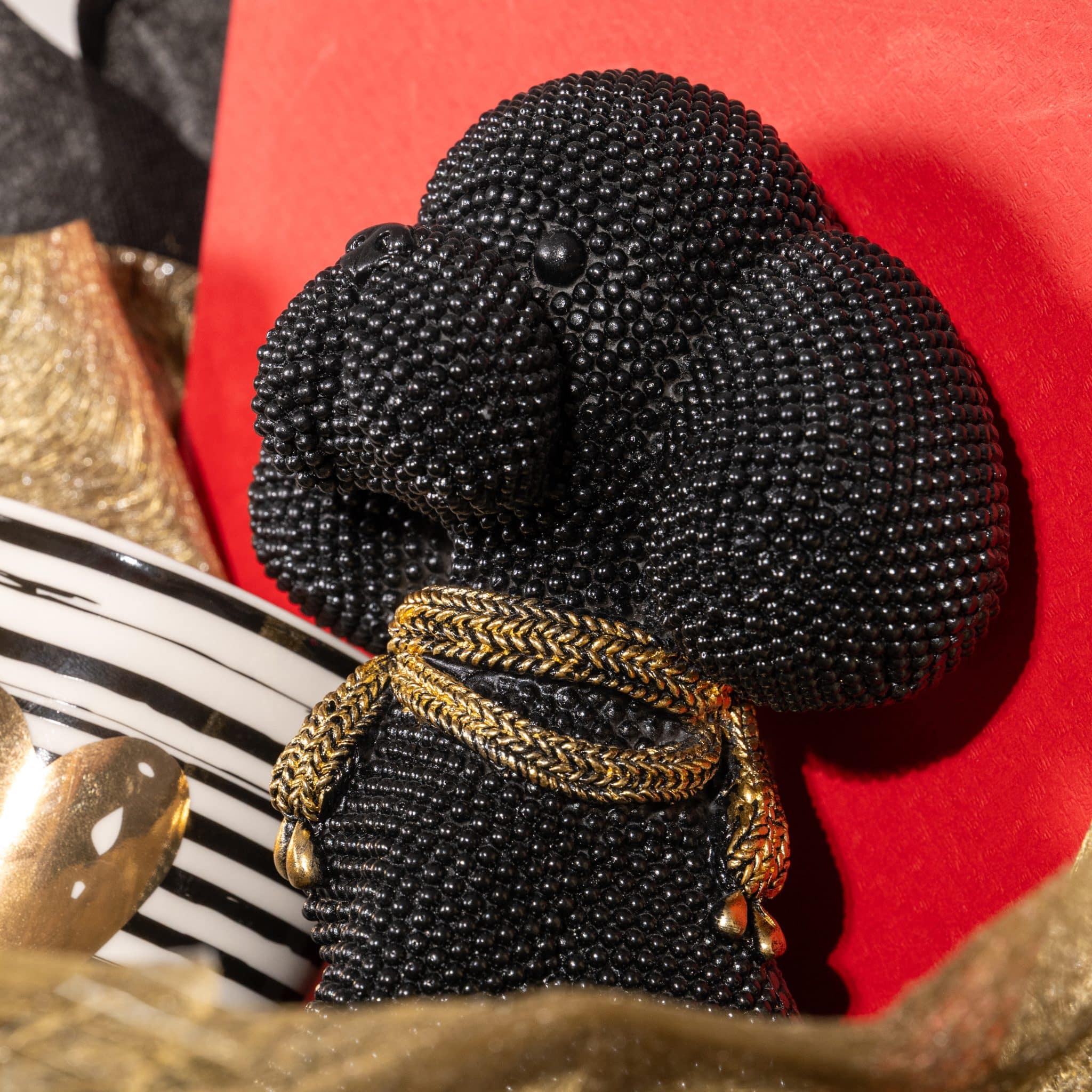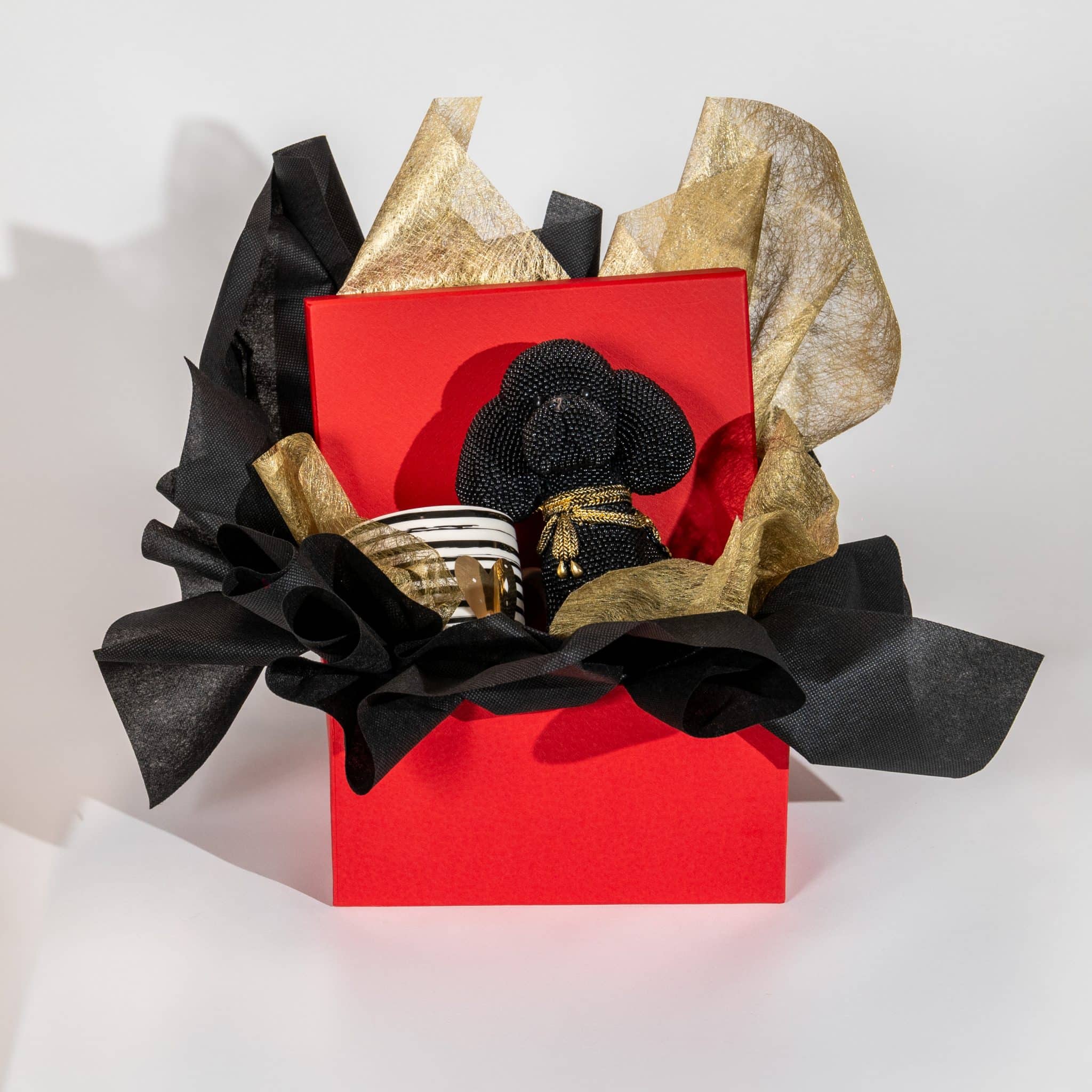 A sophisticated Valentine gift box designed for a truly stylish and memorable surprise. This elegant arrangement features a decorative black teddy with gold details, a modern love-themed mug, and premium black and gold wrapping, all beautifully presented in a luxury red gift box. A perfect choice for a chic, romantic gesture that combines love, elegance, and timeless style.