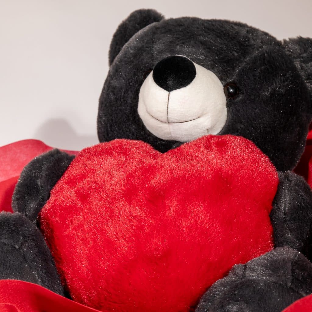 Plush black teddy bear holding a red heart