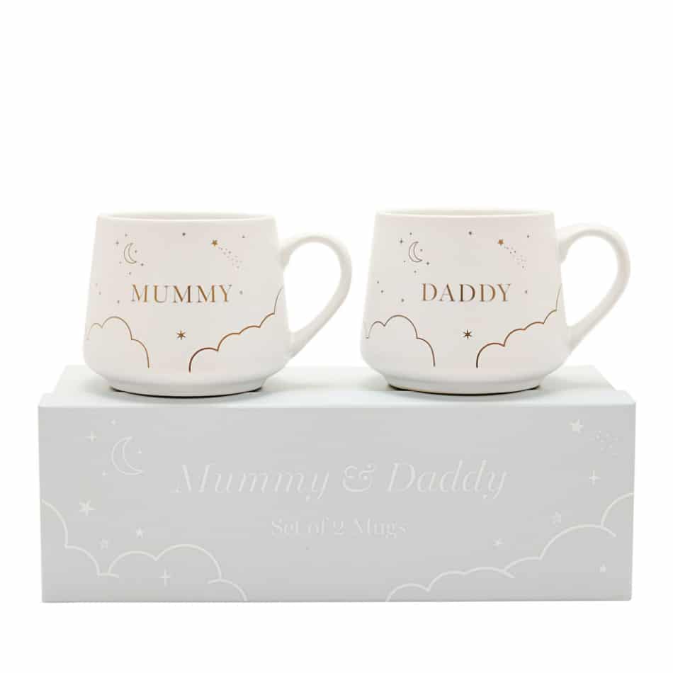 The white stoneware mugs offer a printed finish. One mug features a ‘MUMMY’ gold decal whilst the other is adorned with ‘DADDY’ in matching colour and font. Both feature sky detailing with images of clouds and stars with the quote, To be a parent is to be a little one s everything.