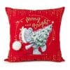 This Christmas pillow features a cute teddy bear holding a festive Christmas tree.