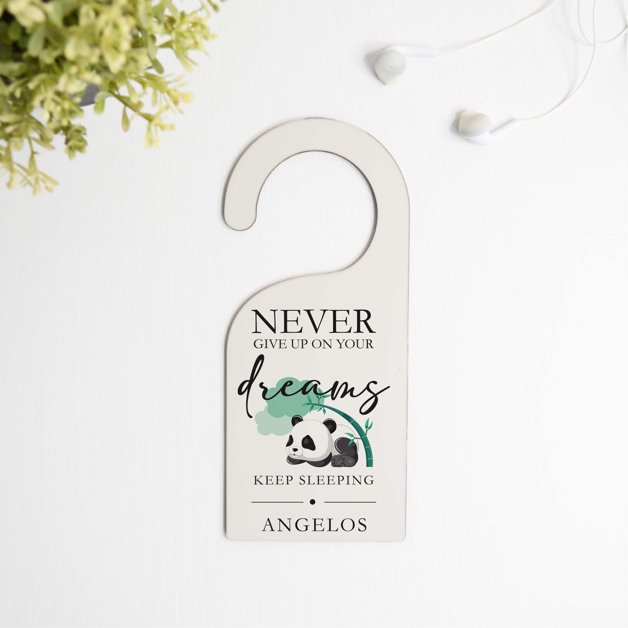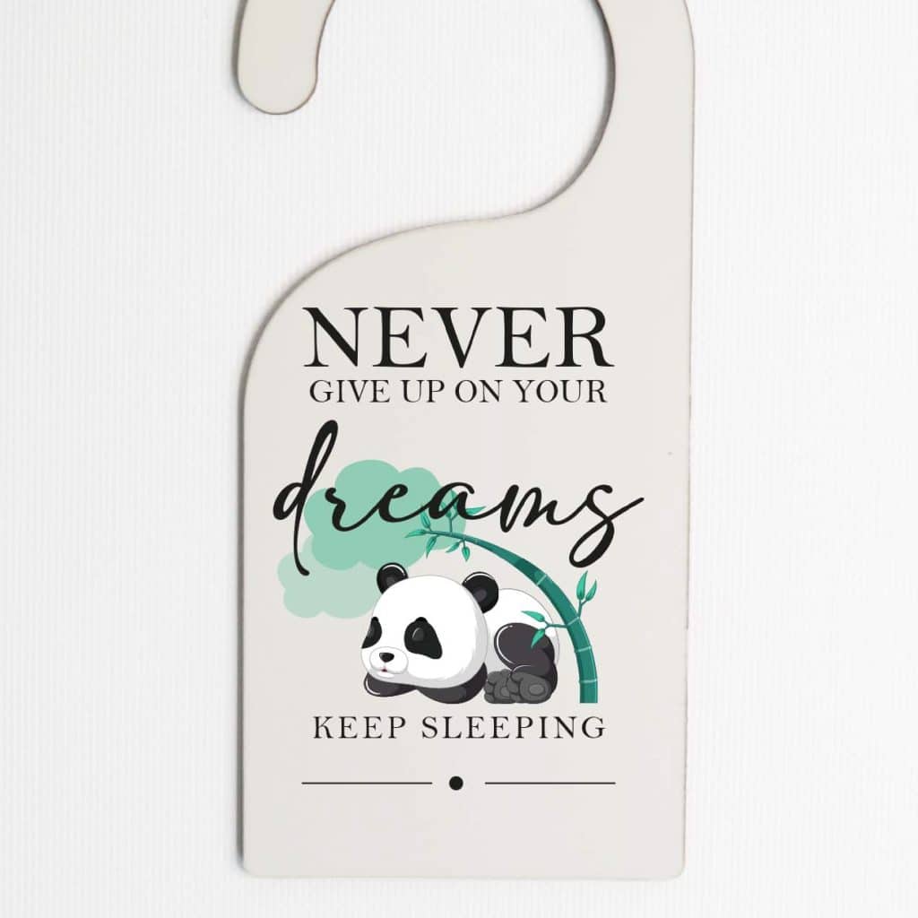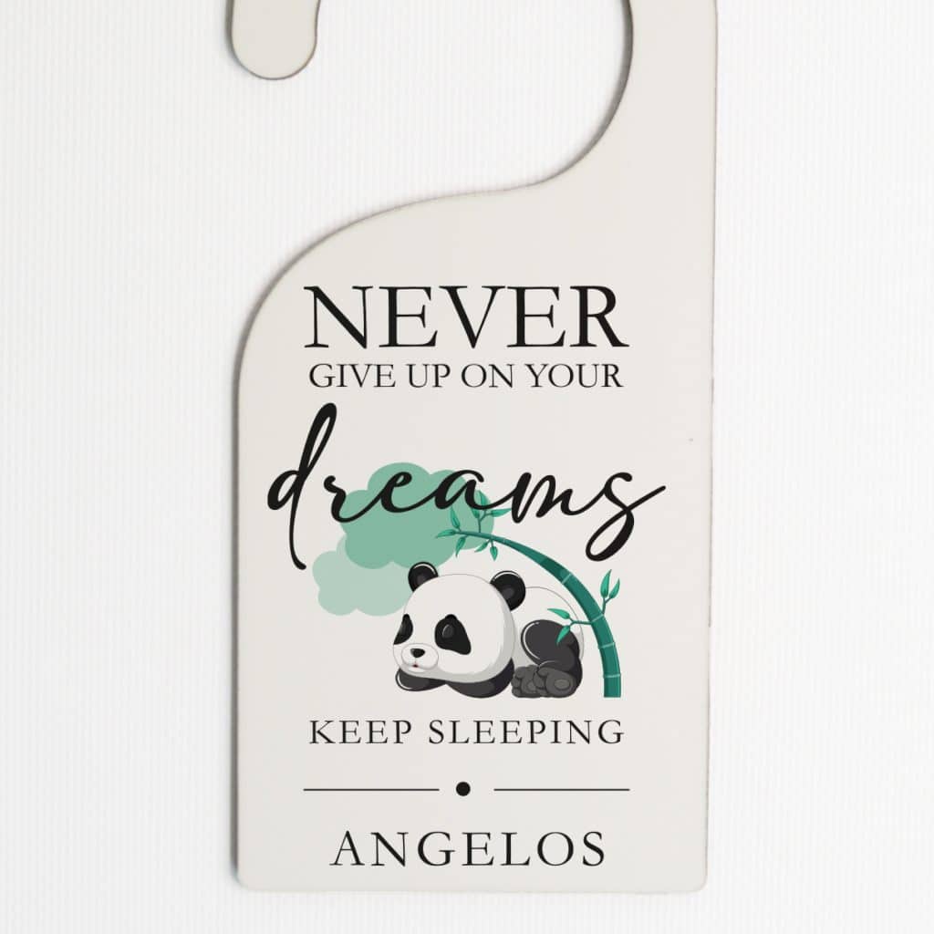This adorable door hanger featuring a cute panda bear and the inspiring words “never give up on your dreams” is the perfect addition to any nursery or child’s room. Made from durable 3mm hardboard material, this personalized door hanger adds a touch of charm and motivation to any space. Hang it on the doorknob to remind your little one to always pursue their dreams and never lose hope.