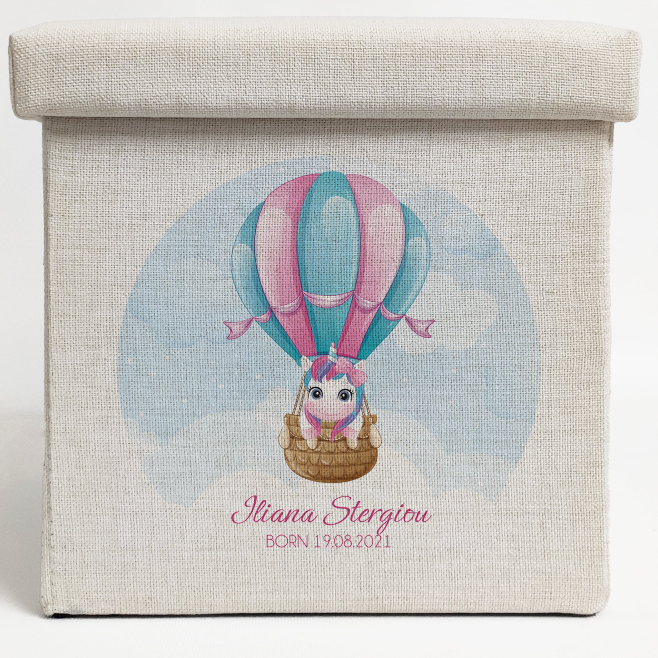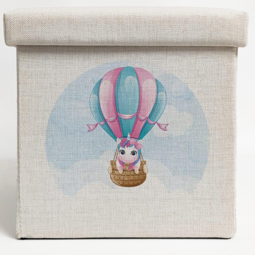 Personalised Storage Stool- Unicorn in Hot Air Balloon with Name and Date
