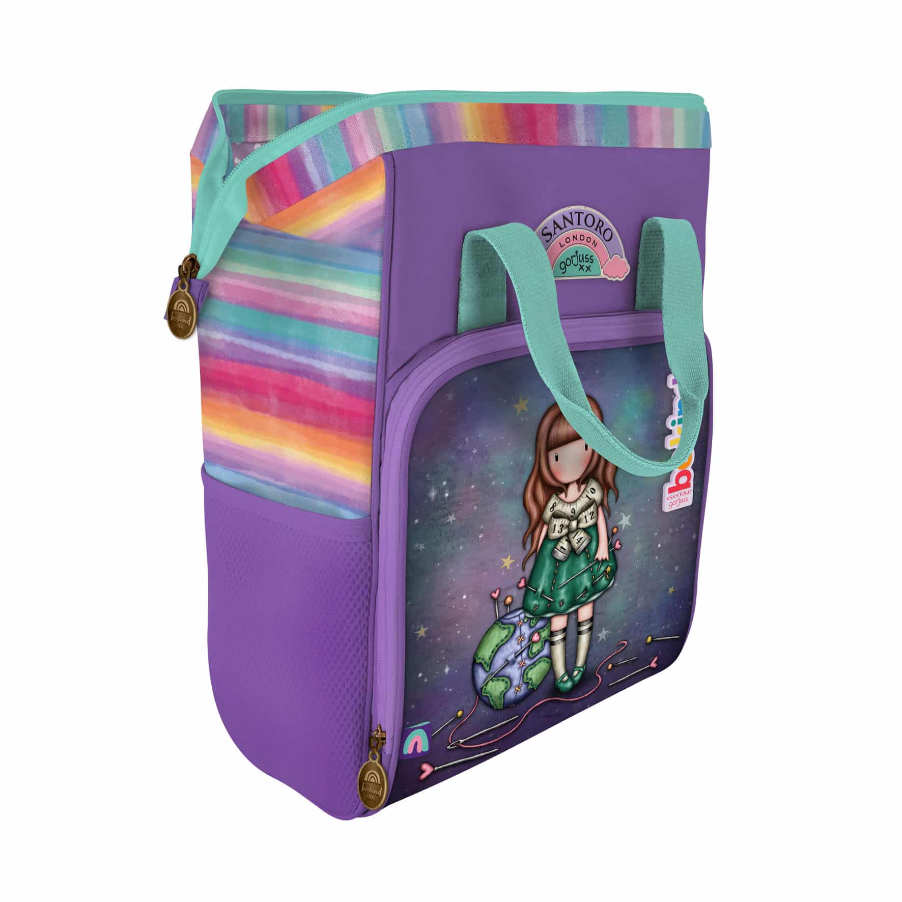 This Gorjuss Be Kind Rucksack features a frame mechanism for easy access, a zipped front pocket, an internal pocket and two water bottle pockets.