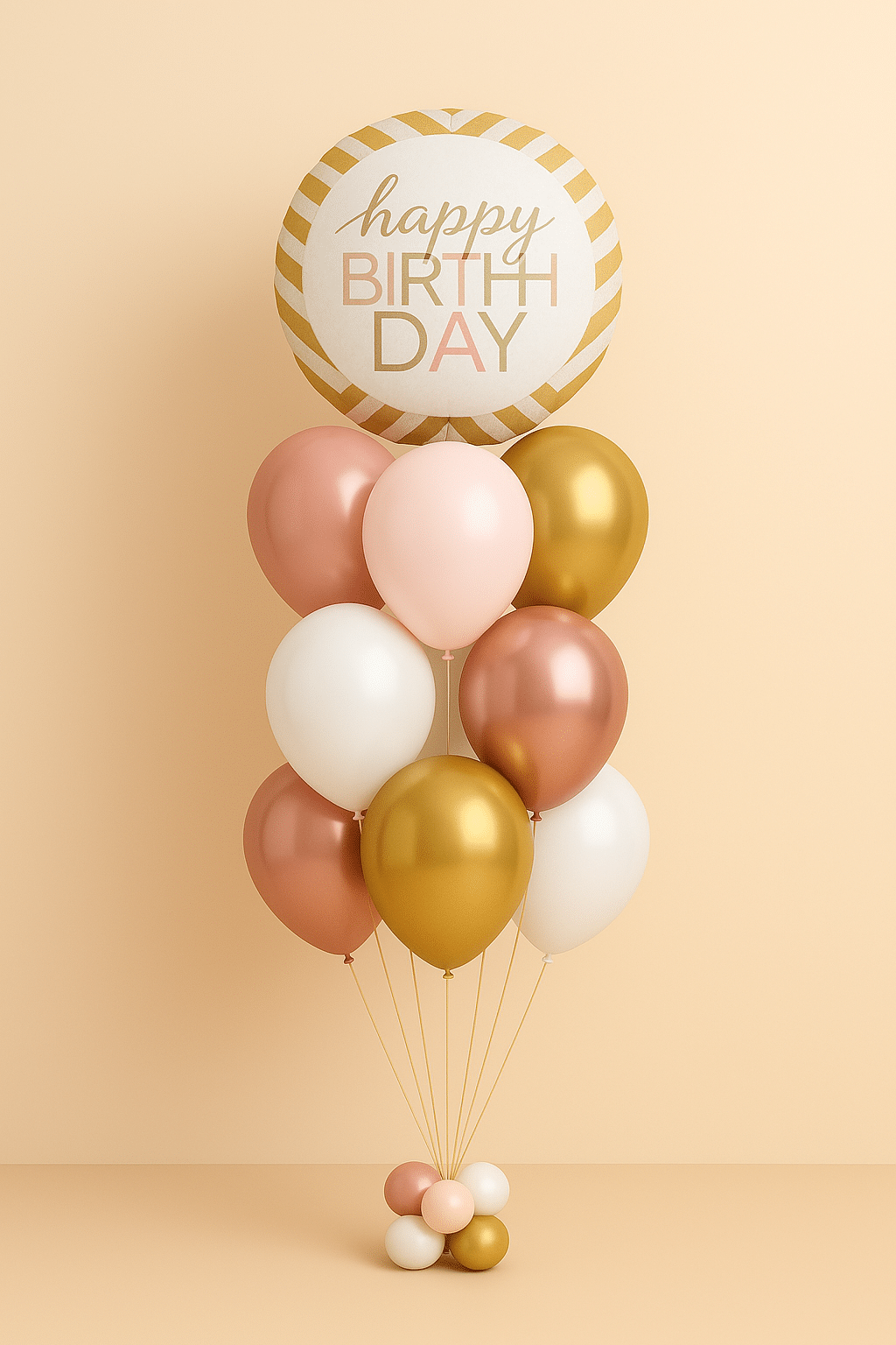 A stunning balloon arrangement featuring a round “Happy Birthday” foil balloon with golden stripes, complemented by a luxurious mix of gold, rose gold, and white latex balloons.