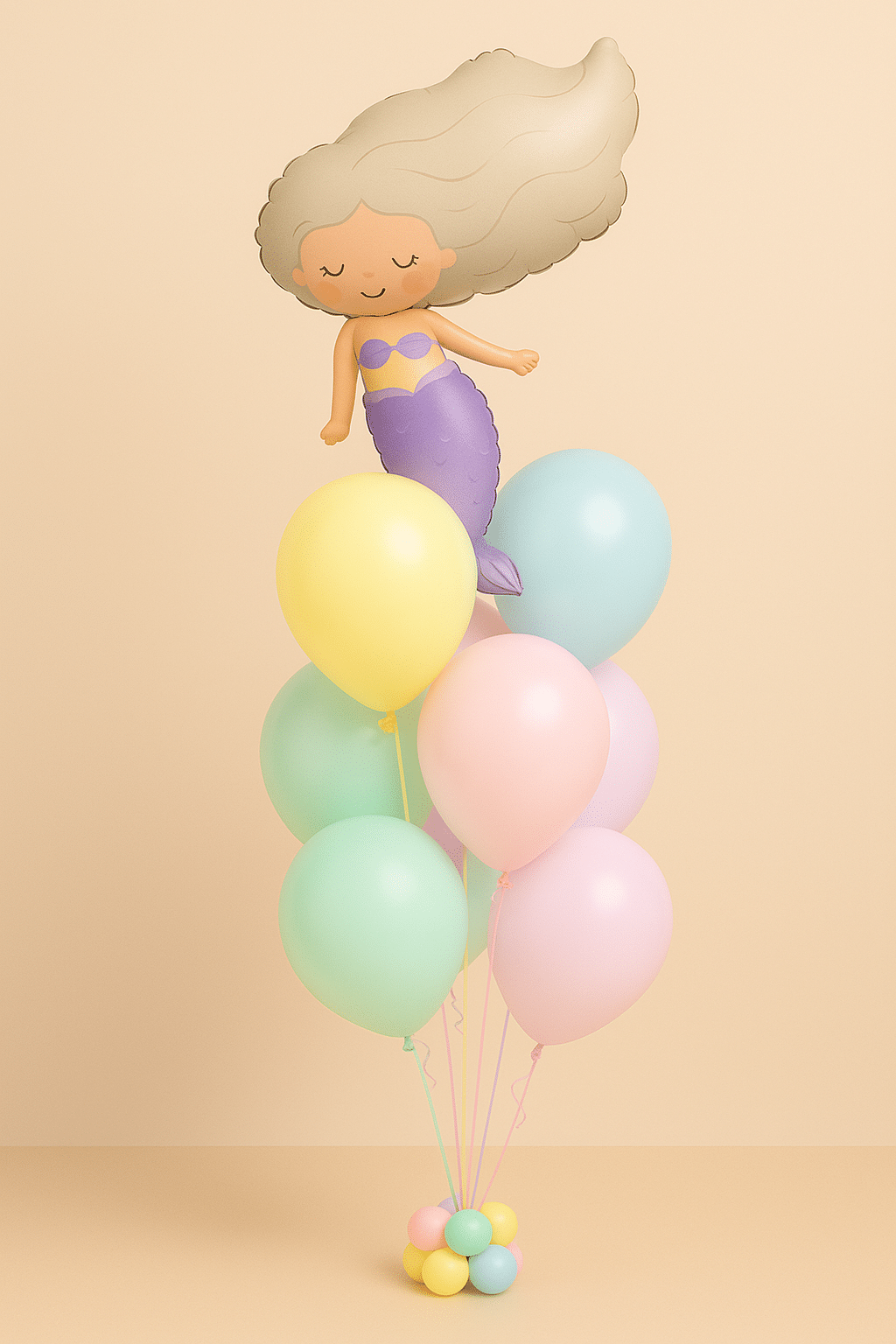 Bring a wave of magic to your party with our “Mermaid Pastel Celebration” balloon bouquet! Featuring soft pastel colors and a delightful mermaid topper, this bouquet is perfect for birthdays or ocean-themed celebrations.