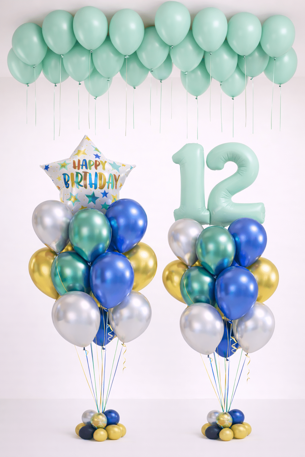 12 Latex balloons in mint, blue, gold, and silver chrome tones