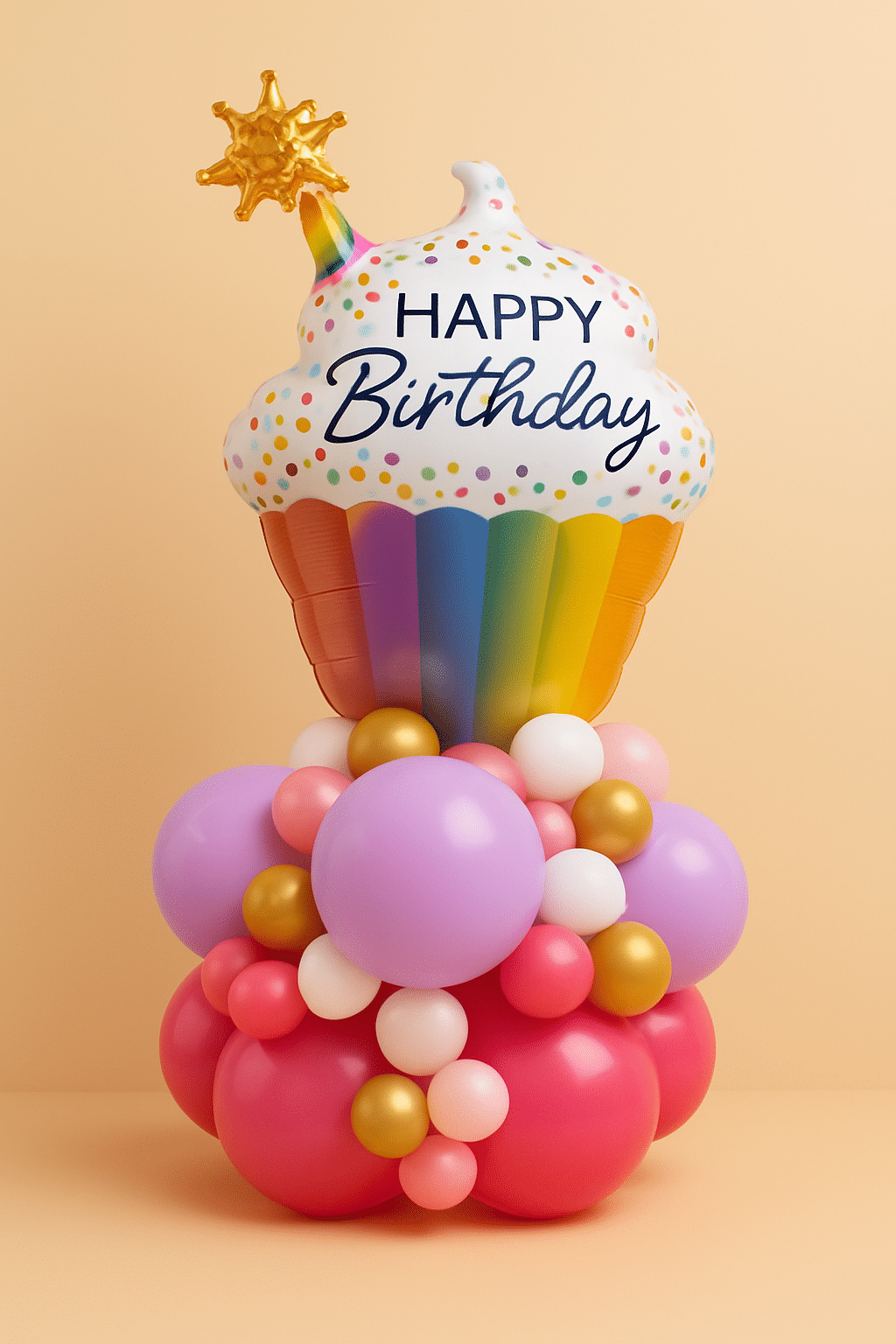 1 jumbo foil balloon in the shape of a rainbow cupcake with a “Happy Birthday” message