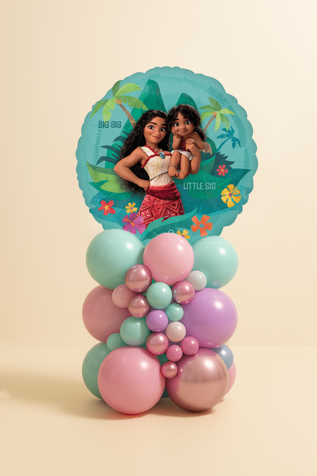 Large round foil balloon featuring Moana Big Sis & Little Sis tropical design