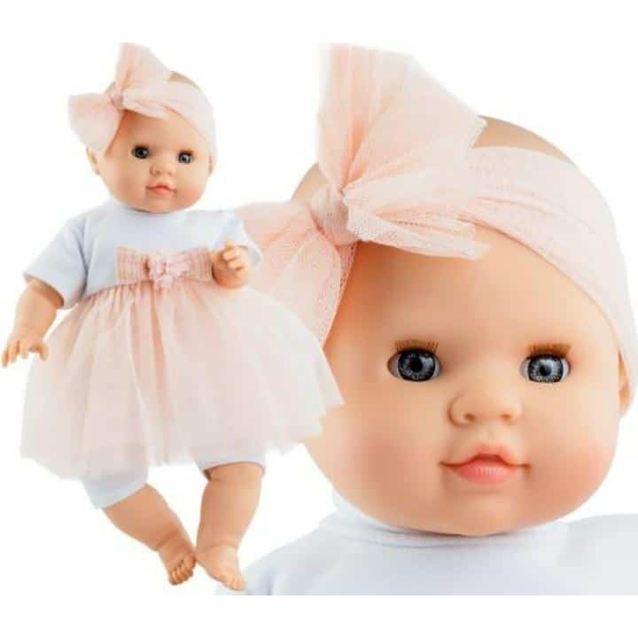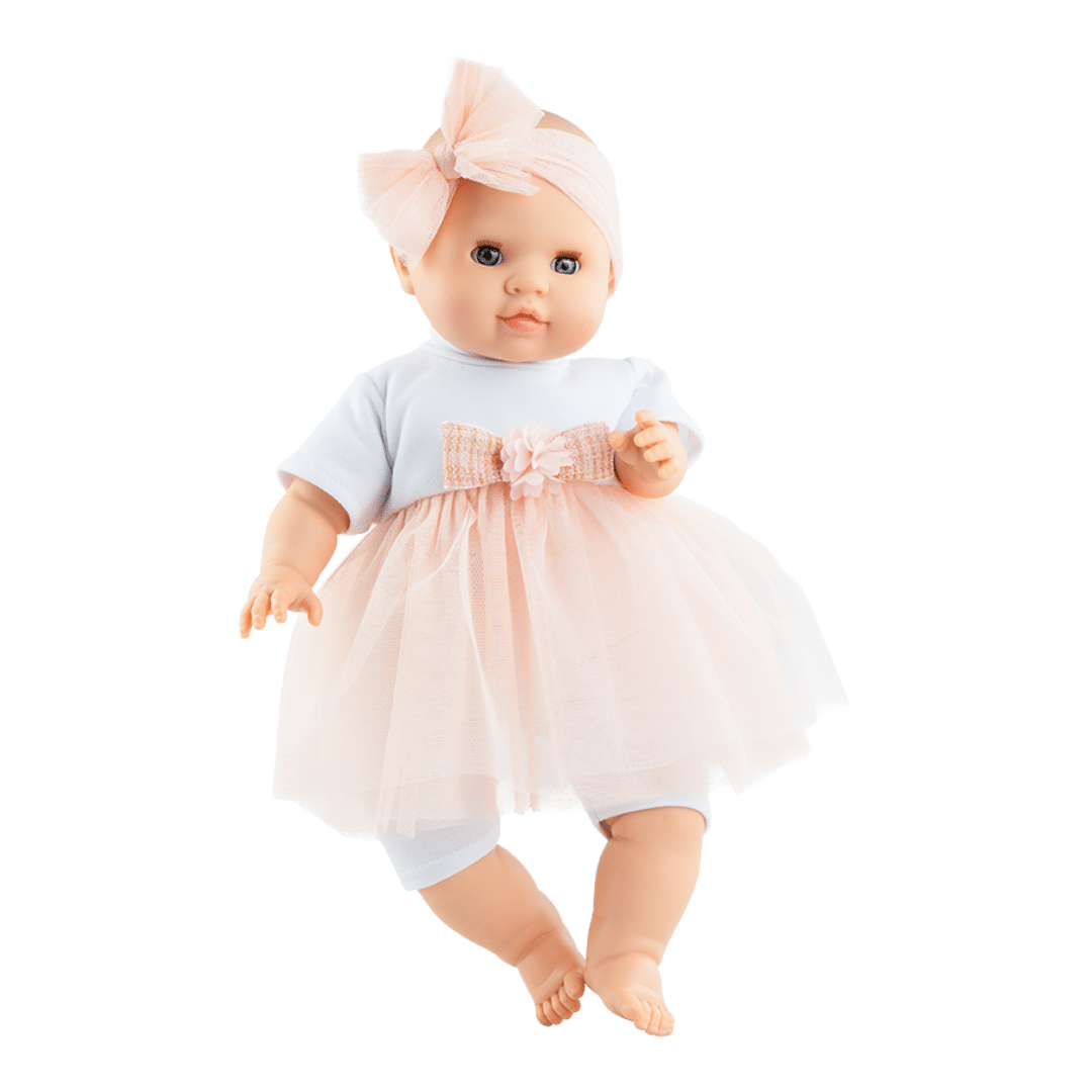 Toñi is a 36 cm doll with a stuffed body and moving eyes. She wears a dress with a white cotton top, a pink tulle skirt and headband, and white shorts.