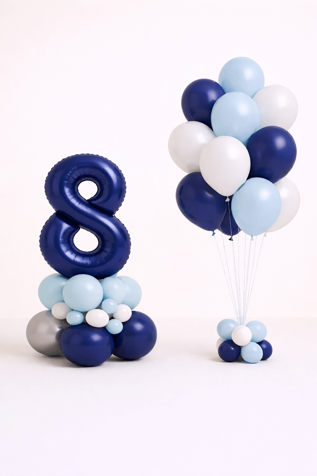 Latex balloons in navy blue, ice blue, white, and silver chrome tones